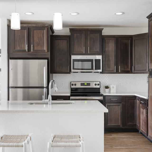 • Gourmet Kitchens with Stainless Steel Appliances, Quartz Countertops, and Wood Panel Cabinets